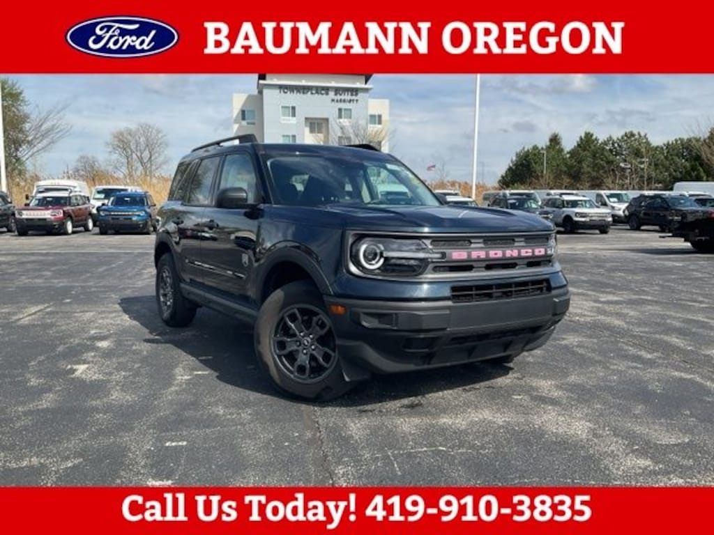 Recent Arrival! Odometer is 8959 miles below market average! CARFAX One-Owner. Blue Metallic 2022 Ford Bronco Sport Big Bend 1.5L EcoBoost 4D Sport Utility 8-Speed Automatic 4WD We are open and ready to serve you! Shop safely and conveniently from the comfort of your home. Contact us today to schedule your home delivery ! Baumann Ford Oregon Toledo Ohio Perrysburg Bowling Green Rossford Curtice Oak Harbor Woodville Monroe Michigan Temperance Erie Repair Facility Body Shop Collision Center Parts Service New Used Leasing Low Payment Low Payments Ford Motorcars Automobile Auto Cars Trucks SUV Sales. FULLY DETAILED, 3.80 Axle Ratio, 4-Wheel Disc Brakes, 4G LTE Wi-Fi Hotspot Credit, 6 Speakers, ABS brakes, Air Conditioning, Alloy wheels, AM/FM radio: SiriusXM, AM/FM Stereo, Auto High-beam Headlights, Automatic temperature control, Brake assist, Compass, Delay-off headlights, Driver door bin, Driver vanity mirror, Dual front impact airbags, Dual front side impact airbags, Electronic Stability Control, Emergency communication system: SYNC 3 911 Assist, Equipment Group 200A, Four wheel independent suspension, Front anti-roll bar, Front Bucket Seats, Front Center Armrest, Front reading lights, Fully automatic headlights, Heated door mirrors, Illuminated entry, Knee airbag, Low tire pressure warning, Occupant sensing airbag, Outside temperature display, Overhead airbag, Overhead console, Panic alarm, Passenger door bin, Passenger vanity mirror, Power door mirrors, Power steering, Power windows, Radio data system, Rear anti-roll bar, Rear reading lights, Rear seat center armrest, Rear window defroster, Rear window wiper, Remote keyless entry, Roof rack: rails only, Security system, SiriusXM Radio, Speed control, Speed-sensing steering, Speed-Sensitive Wipers, Split folding rear seat, Steering wheel mounted audio controls, SYNC 3 Communications & Entertainment System, SYNC 3/Apple CarPlay/Android Auto, Tachometer, Telescoping steering wheel, Tilt steering wheel, Traction control, Trip computer, Unique Cloth Front Bucket Seats, Variably intermittent wipers, Wheels: 17 Carbonized Gray-Painted Aluminum.