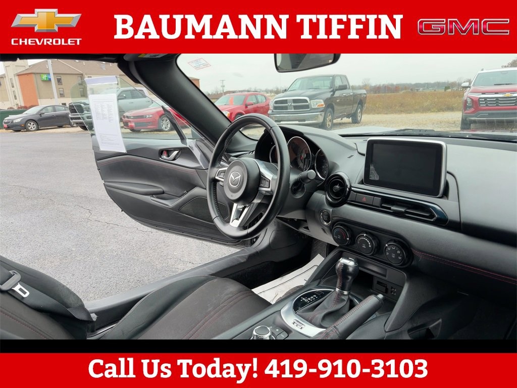 Black W/Red Stitching Cloth, 17 x 7 Dark Gunmetal Aluminum Alloy Wheels, 4-Wheel Disc Brakes, 9 Speakers, ABS brakes, Advanced Keyless Entry System, Air Conditioning, Alloy wheels, AM/FM radio: SiriusXM, Brake assist, Bumpers: body-color, CD player, Cloth Upholstery, Convertible roof wind blocker, Driver vanity mirror, Dual front impact airbags, Dual front side impact airbags, Electronic Stability Control, Emergency communication system: Mazda Connect, Four wheel independent suspension, Front anti-roll bar, Front Bucket Seats, Front Center Armrest, Glass rear window, Illuminated entry, Leather Shift Knob, Low tire pressure warning, Occupant sensing airbag, Outside temperature display, Panic alarm, Passenger vanity mirror, Power door mirrors, Power steering, Power windows, Radio data system, Radio: AM/FM/HD Stereo w/CD Player, Rear anti-roll bar, Rear window defroster, Reclining Front Bucket Seats, Remote keyless entry, Speed control, Speed-sensing steering, Spoiler, Sport steering wheel, Steering wheel mounted audio controls, Tachometer, Tilt steering wheel, Traction control, Trip computer, Variably intermittent wipers, Wheel Locks, Black W/Red Stitching Cloth.